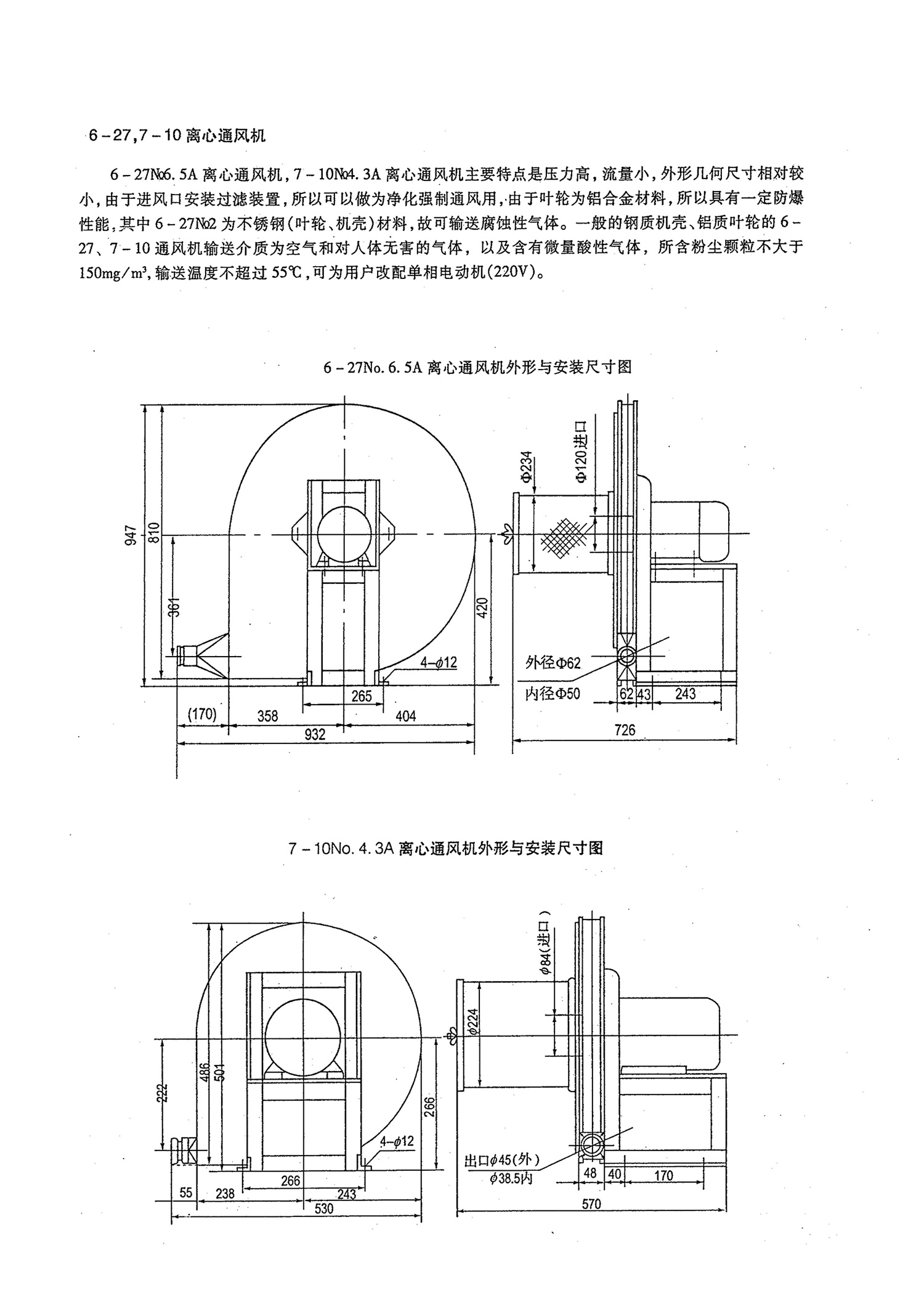 6-27No6.5A离心通风机,7-10No4.3A离心通风机主要特点是压力高,流量小,外形几何尺寸相对较小,由于进风口安装过滤装置,所以可以做为净化强制通风用,由于叶轮为铝合金材料,所以具有一定防爆性能,其中6-27No2为不锈钢(叶轮、机壳)材料,故可输送腐蚀性气体。