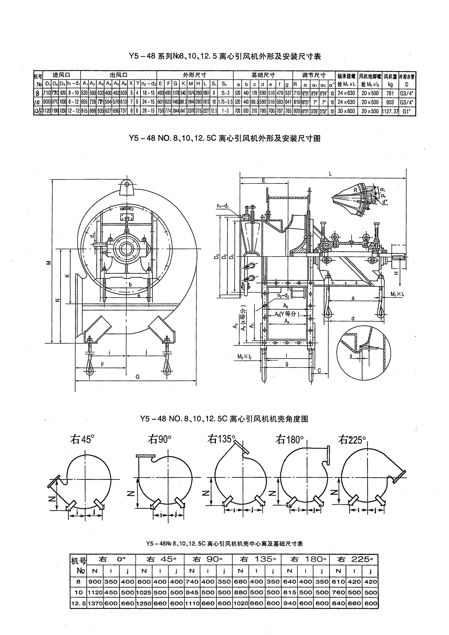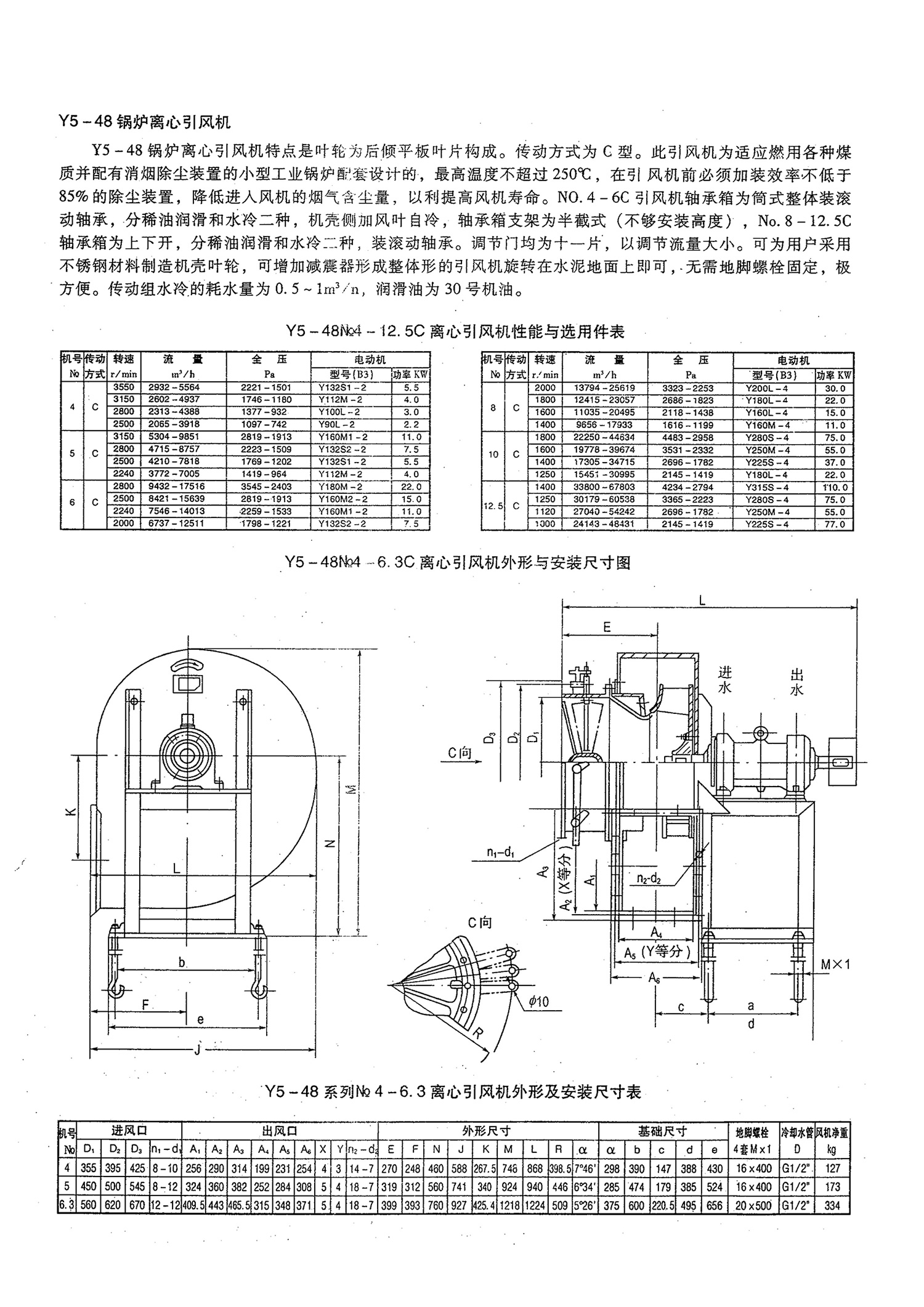 Y5-48 锅炉离心引风机特点是叶轮为后倾平板叶片构成。传动方式为C型。此引风机为适应燃用各种煤质并配有消烟除尘装置的小型工业锅炉配套设计的,最高温度不超过250℃,在引风机前必须加装效率不低于85%的除尘装置,降低进入风机的烟气含尘量,以利提高风机寿命。