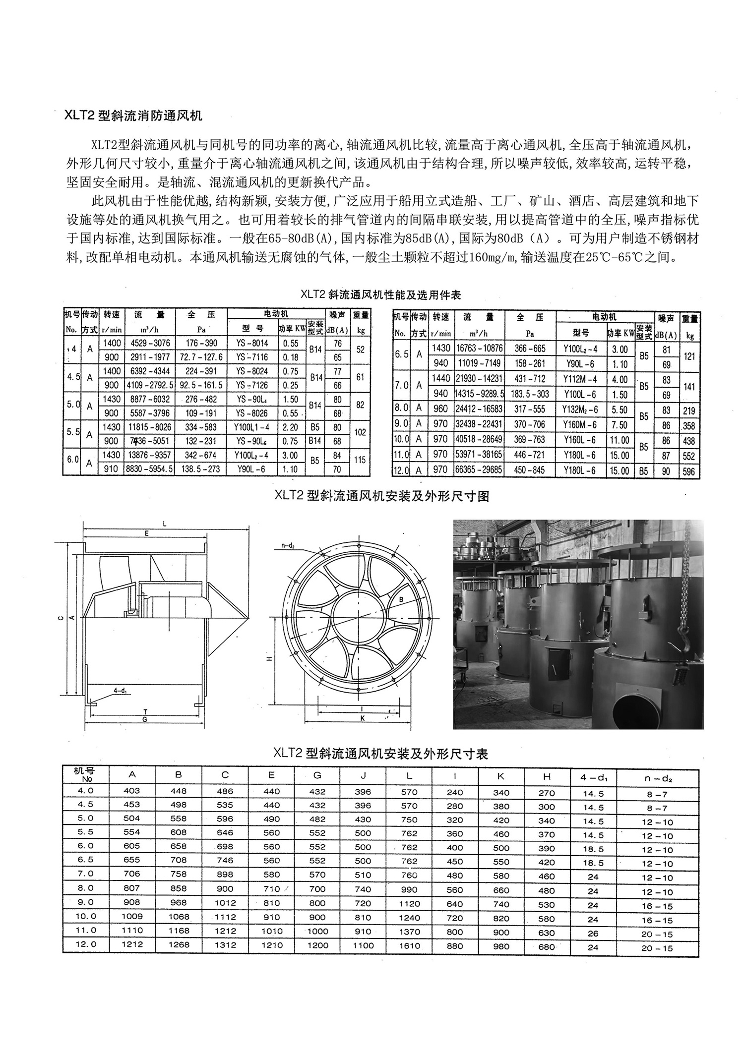 XLT2 型斜流通风机与同机号的同功率的离心,轴流通风机比较,流量高于离心通风机,全压高于轴流通风机,外形几何尺寸较小,重量介于离心轴流通风机之间,该通风机由于结构合理,所以噪声较低,效率较高,运转平稳,坚固安全耐用。是轴流、混流通风机的更新换代产品。