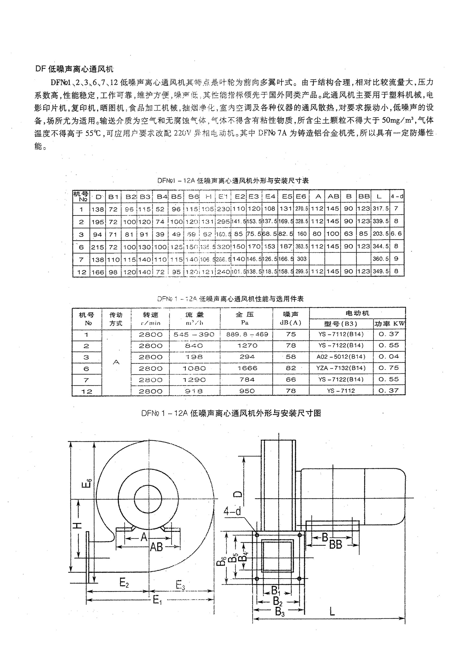 DFNo1、2、3、6、7、12低噪声离心通风机其特点是叶轮为前向多翼叶式。由于结构合理,相对比较流量大,压力系数高,性能稳定,工作可靠,维护方便,噪声低,其性能指标领先于国外同类产品。此通风机主要用于塑料机械,电影印片机,复印机,晒图机,食品加工机械,抽烟净化,室内空调及各种仪器的通风散热,对要求振动小,低噪声的设备,场所尤为适用。