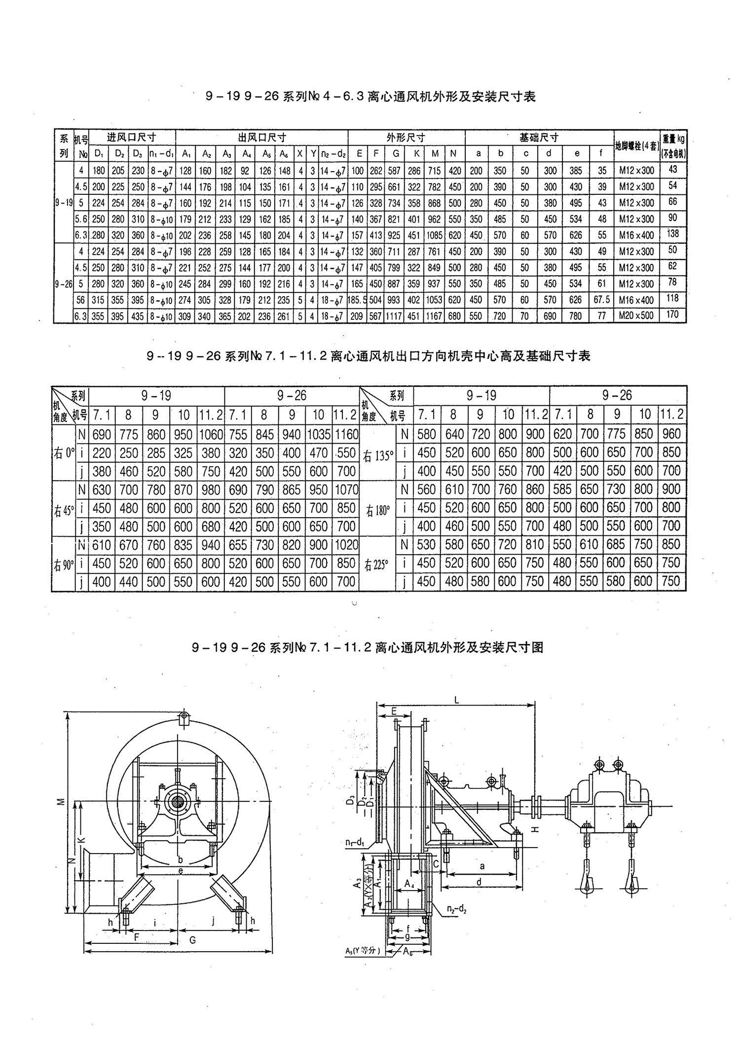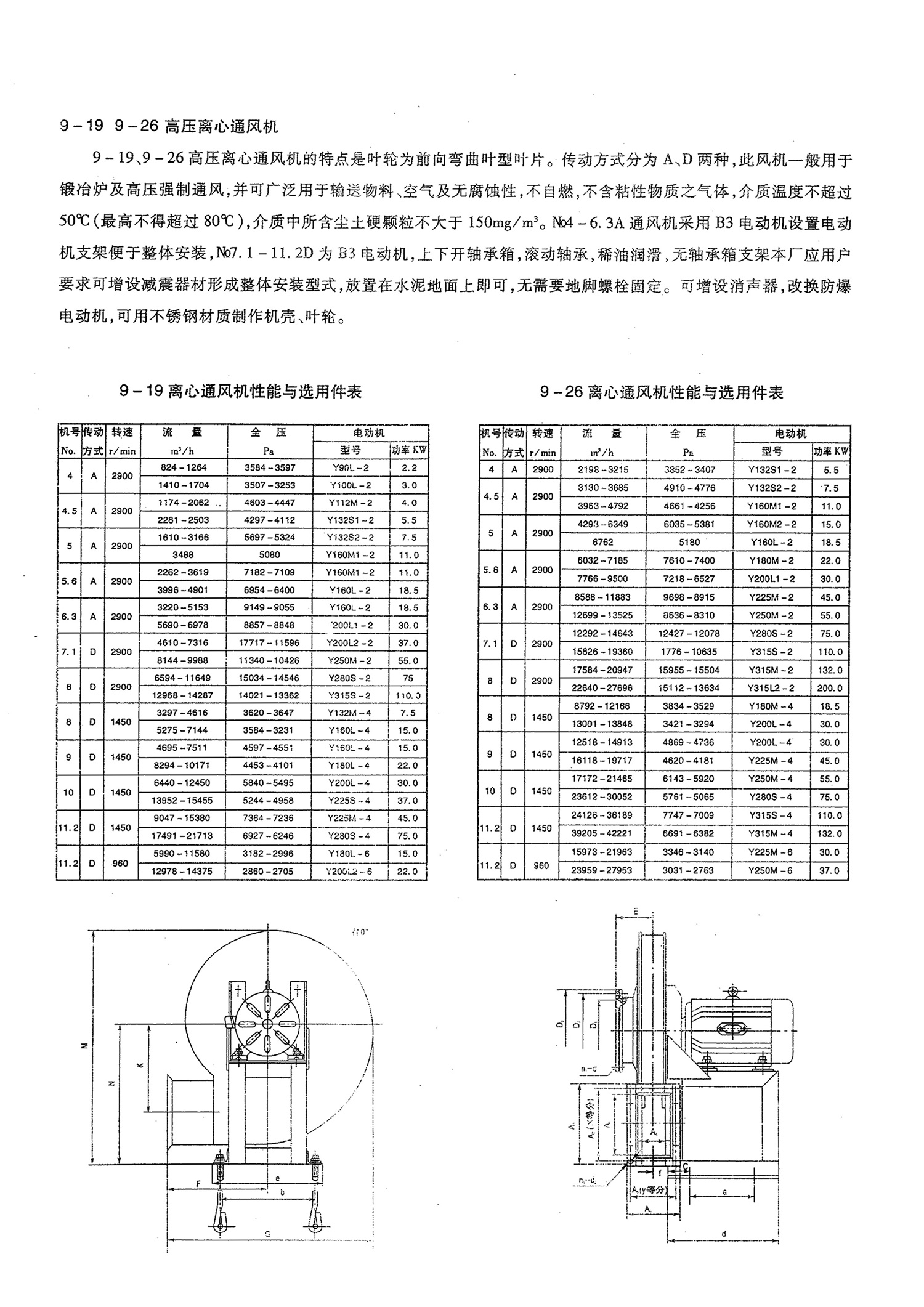 9-19、9-26高压离心通风机的特点是叶轮为前向弯曲叶型叶片。传动方式分为A、D两种,此风机一般用于锻冶炉及高压强制通风,并可广泛用于输送物料、空气及无腐蚀性,不自燃,不含粘性物质之气体,介质温度不超过50℃(最高不得超过80℃),介质中所含尘土硬颗粒不大于150mg/m。